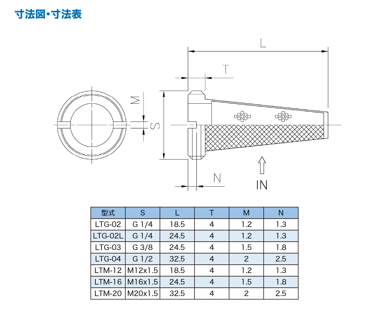 フィルタ ミニストレーナタイプ LTG/LTMシリーズ 最高使用圧力:20MPa 超小型フィルタエレメント 特徴 超コンパクトにレイアウト可能。 テーパー形状により管路抵抗を減少。 シールレス構造による高い耐熱性。 2種類のネジタイプにより流体機器に容易に取り付け。 仕様 使用流体 水、空気、蒸気、ガス、油など、SUS316を侵食しない流体 最高使用圧力 20MPa 使用温度 -20℃~200℃ 材質 SUS316 設計図 前の製品へ 一覧へ戻る 次の製品へ